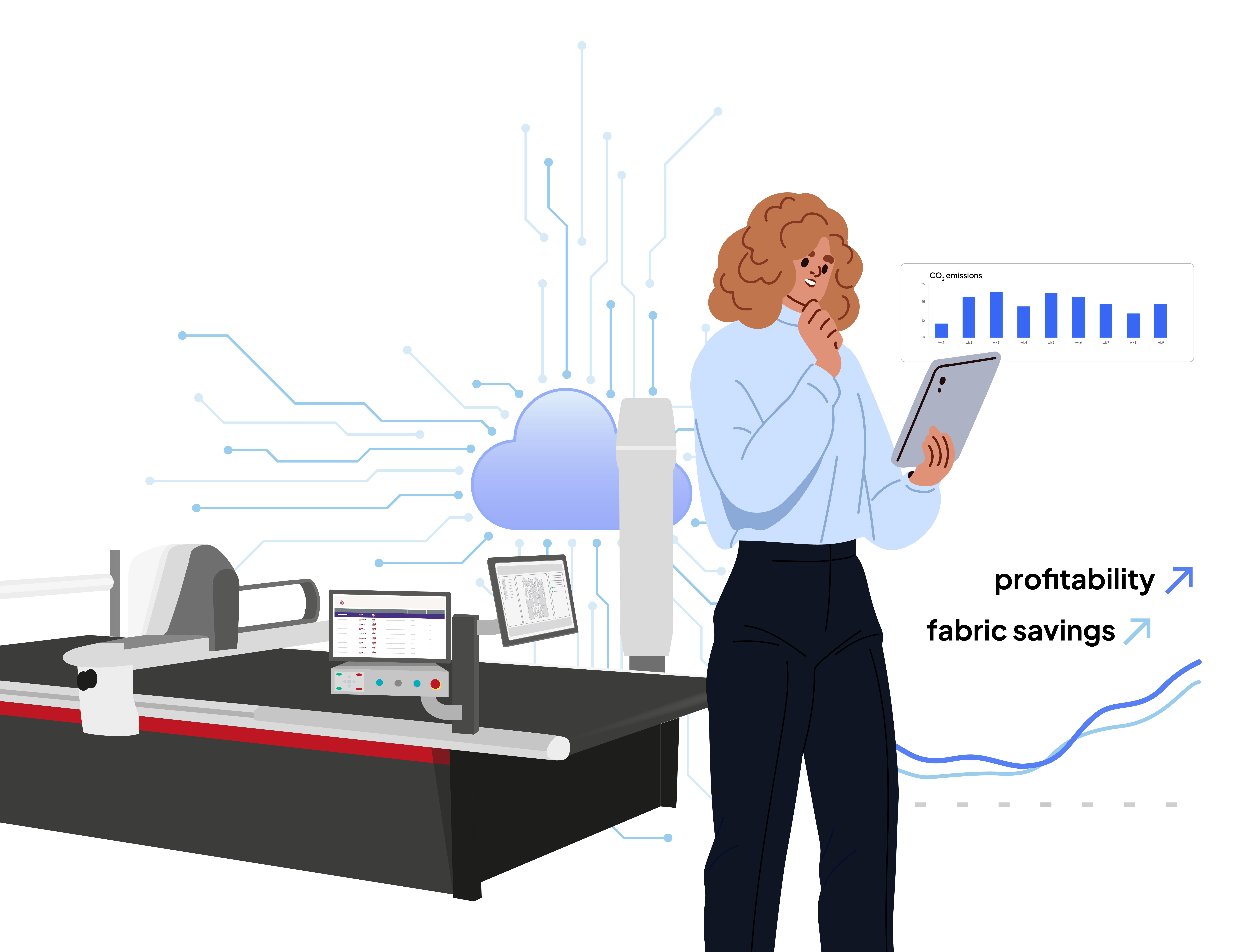 Valia sets a new standard for production with a bold approach to connectivity, performance, and sustainability. It tackles the most pressing challenges facing manufacturers today—inefficiency, lack of visibility, and sustainability gaps—by delivering a connected, intelligent, and scalable solution that enhances cutting room performance.